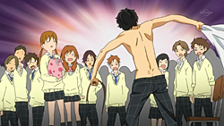 Puis il y a aussi un soin apporté aux angles de vue, bien utilisés et dynamisant l'animé à sa manière en toute discrétion. Quant à l'Ost, c'est peut-être l'un des points faibles de l'animé pour le moment, en effet, il est bien trop discret ! Je me suis même demandé s'il y en avait un à la fin de ces deux épisodes ?! Totalement l'inverse des bruitages, très marrants, extrêmement présents et brillamment utilisés, renforçant superbement l'humour perpétuel de l'animé : coup de tir-bouchon lorsque la pression est à son maximum, tir de revolver lorsqu'on vise dans le mille des sentiments, ou encore chute qui provoque un improbable accident de circulation, et bien d'autres ! Les bruitages sont donc un autre très bon point de l'animé qui contraste hélas avec la qualité de l'Ost.