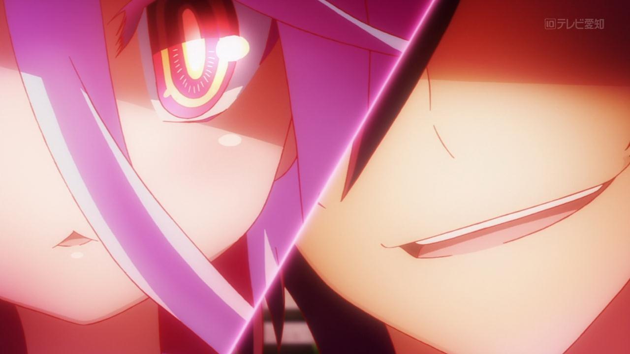 Ensuite contrairement à Mondaiji qui se basait plus sur des épreuves impossibles à gagner que des jeux, les combats qui se déroulent dans No Game No Life, sont plutôt avec des jeux simples ou liés au hasard, comme des jeux de cartes par exemple. Hasard ? Pas vraiment car grâce aux capacités intellectuelles anormales de notre duo, le hasard n'existe pas, toutes les possibilités et situations sont calculées à l'avance. Cela apporte un excellent aspect stratégique même si c'est à la limite de l'invraisemblable. Notre duo est véritablement ce qui fait la force de l'animé, sortant à chaque fois au bon moment opportun le petit quelque chose improbable qui va changer la donne d'un combat sans issue, apportant un vrai suspense à chaque duel.