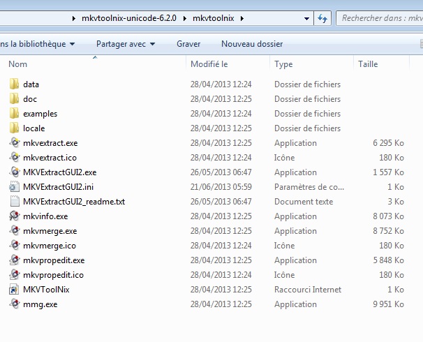 (Ah oui aussi, je viens de voir, il y a une version qu'on installe et une version portable ba j'avais pas encore vu qu'on pouvait vraiment y installer ^^' Prenez ce que vous voulez ^^.) Mais comme ce logiciel est surtout adapté pour les grosses brutes sans coeur, il ne dispose pas nativement d'une interface graphique et tout se lance en écrivant des messages codés dans votre éditeur de commande. Afin de vous évitez un mal de crâne intense, des gens ont eu la bienveillance de créer cette interface graphique ^^ Elle est disponible ici : http://www.videohelp.com/tools/MKVExtractGUI-2 (j'utilise personellement cette version mais il se peut que cette version soit mieux pour vous : http://www.videohelp.com/tools/MKVExtractGUI ). Afin d'utiliser cette interface graphique, il vous faut copier les fichiers dans le même dossier que mkvtoolnix. Vous aurez à peu prêt ça :