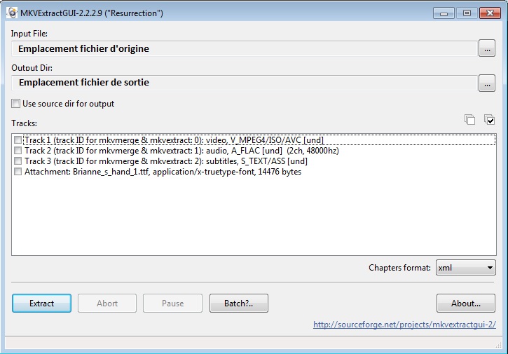 Ici l'on voit bien un fichier vidéo, audio, sous-titre et police. Il vous suffit de cocher les fichiers que vous voulez extraire et spécifier à quel emplacement vous les voulez. Dans notre cas, ce qui nous intéresse c'est seulement le fichier sous-titre donc hop, je ne coche que celui-ci et "Extract" o//