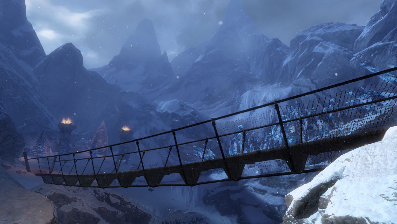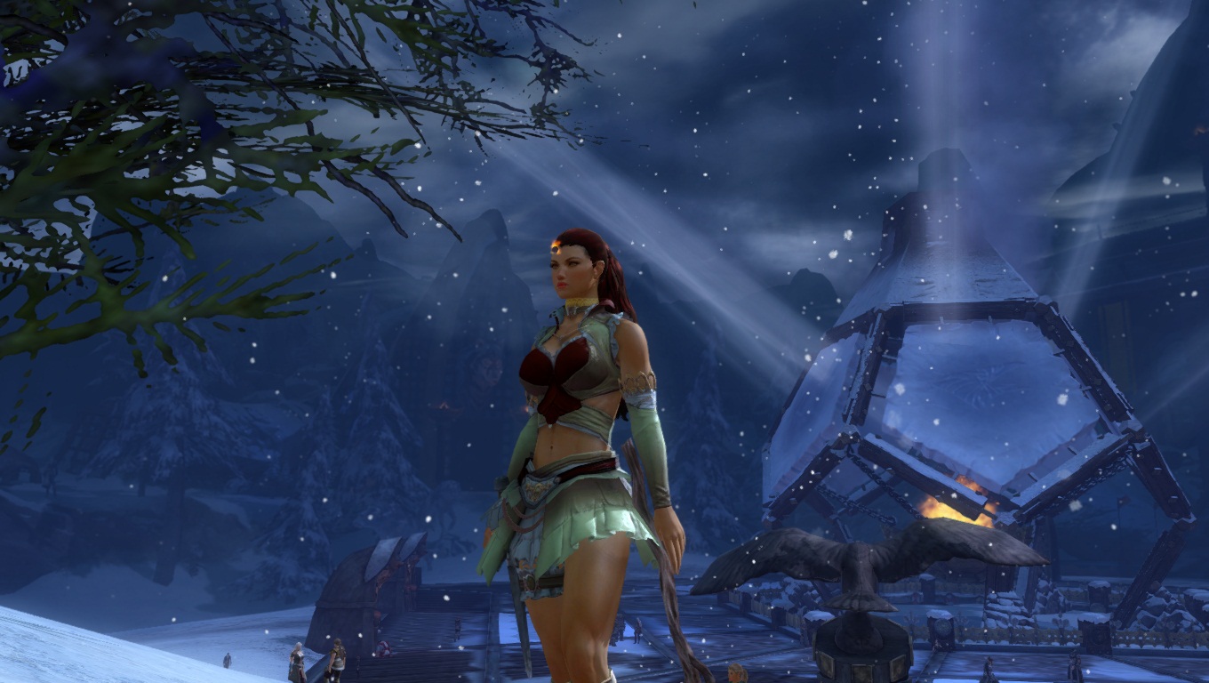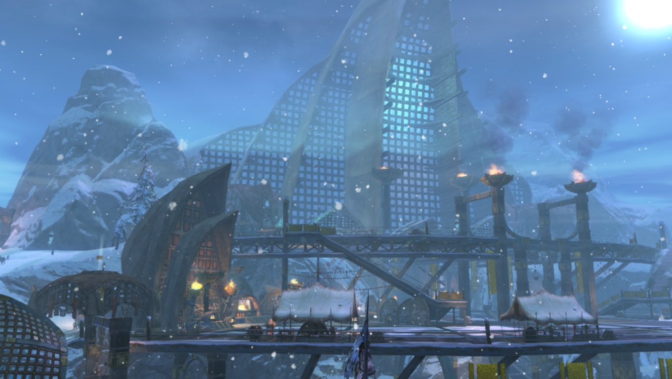 Hoelbrak, la gigantesque ville enneigée des Norns, avec ces grands bâtiments et imposantes statues de glace dédiées aux quatre Grands Esprits de la Nature.
