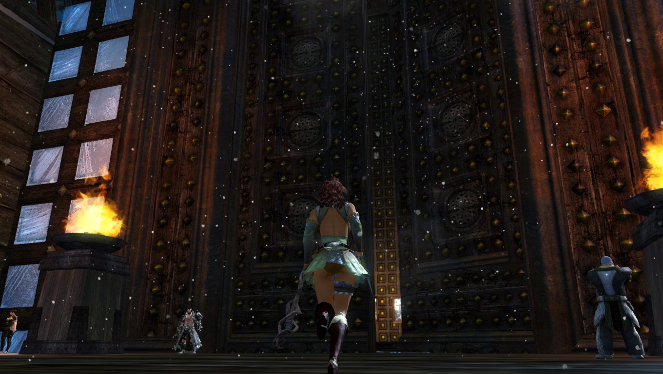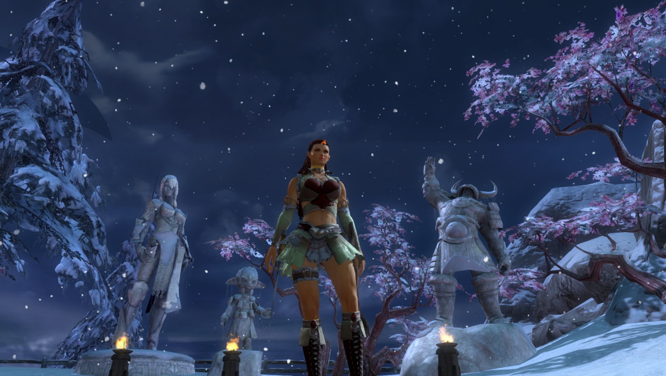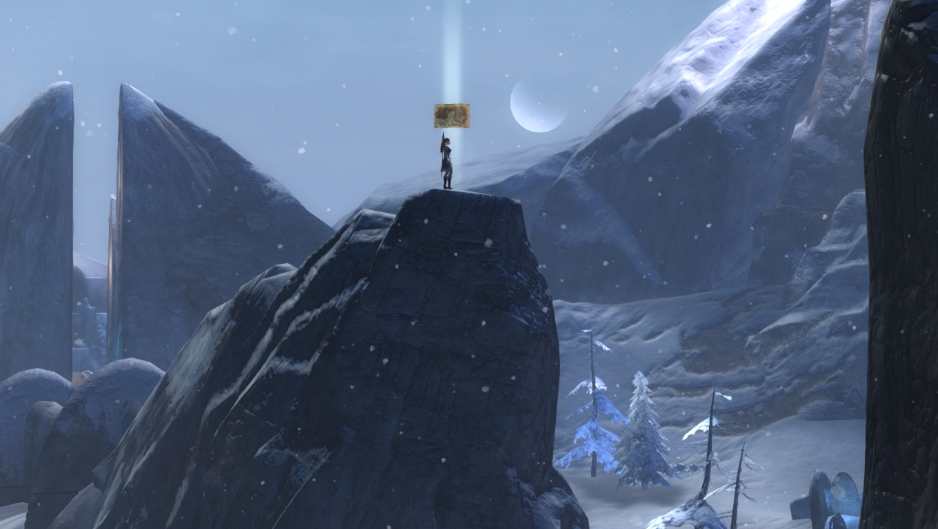 Hoelbrak, la gigantesque ville enneigée des Norns, avec ces grands bâtiments et imposantes statues de glace dédiées aux quatre Grands Esprits de la Nature.