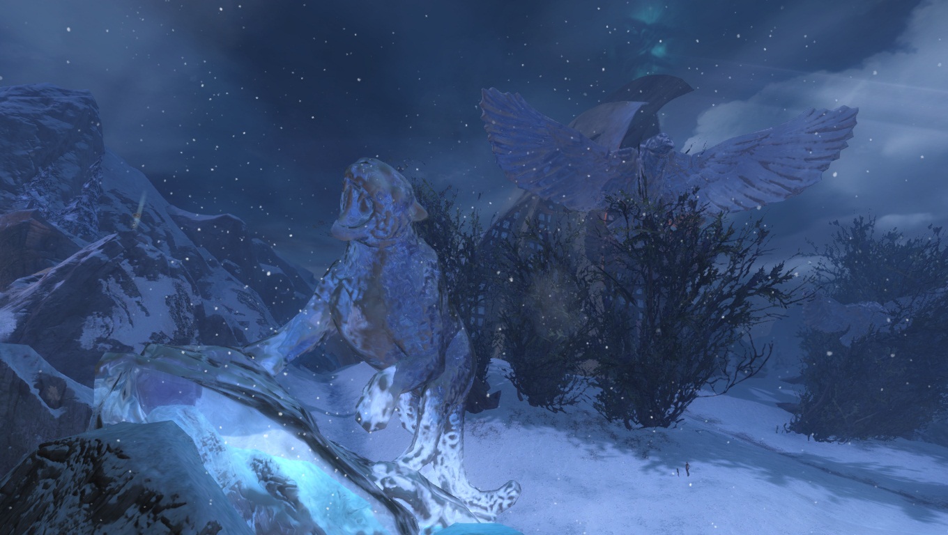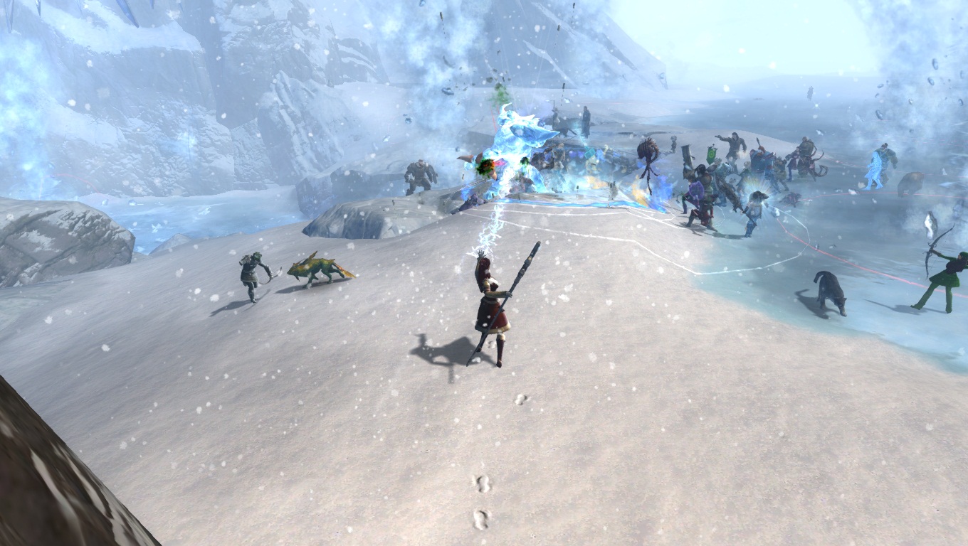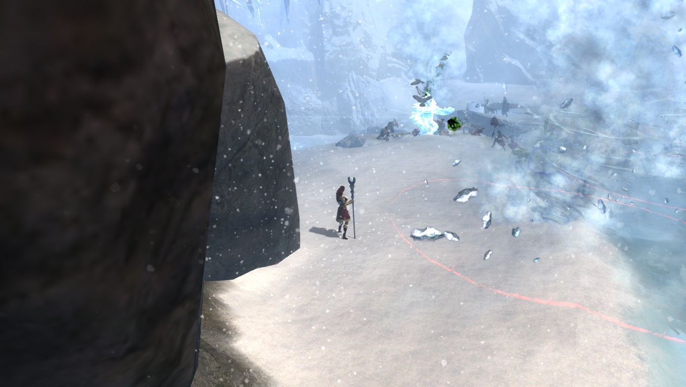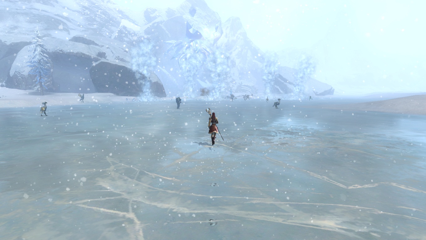 Lorsqu'on parcourt nos territoires sauvages enneigés, il faut toujours s'attendre à croiser de redoutables dangers. Ici, un Chaman des Fils de Svanir pas très content, qui s'est métamorphosé en une immonde créature de glace, et pouvant provoquer de gigantesques cyclones dans la région.