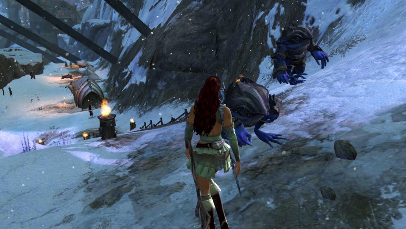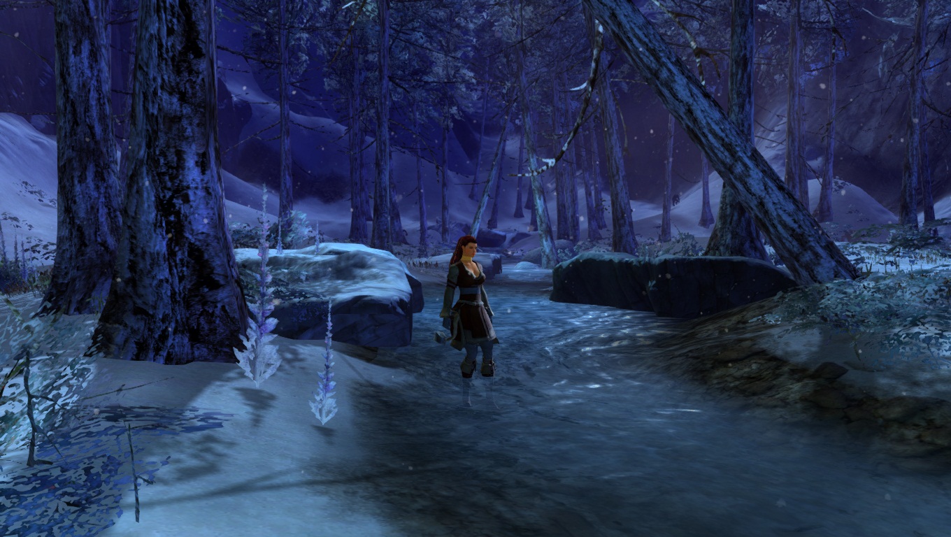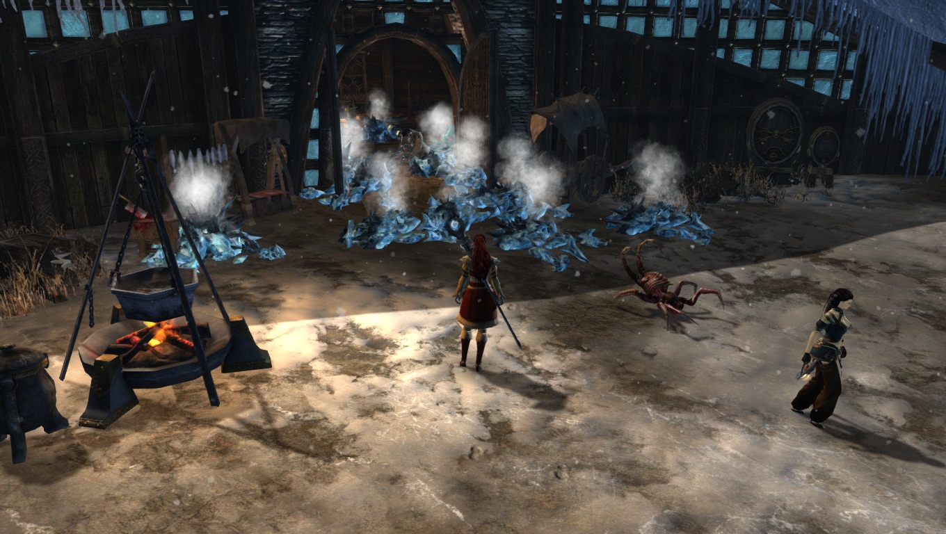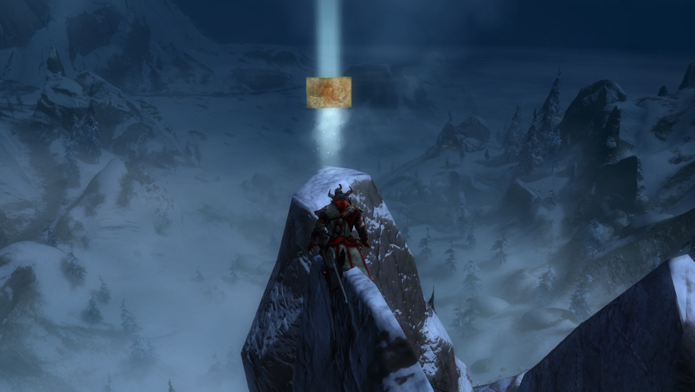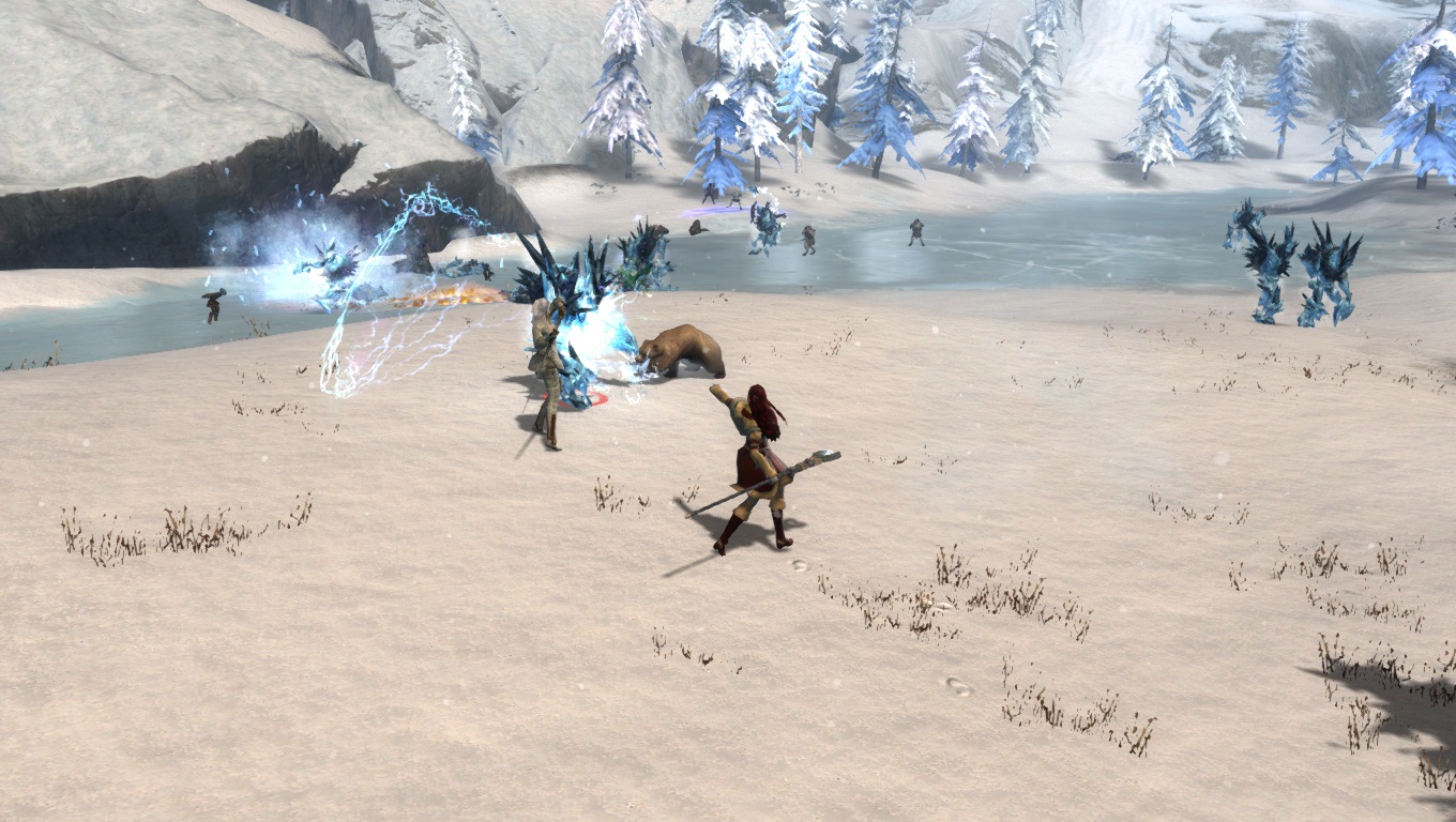 Lorsqu'on parcourt nos territoires sauvages enneigés, il faut toujours s'attendre à croiser de redoutables dangers. Ici, un Chaman des Fils de Svanir pas très content, qui s'est métamorphosé en une immonde créature de glace, et pouvant provoquer de gigantesques cyclones dans la région.