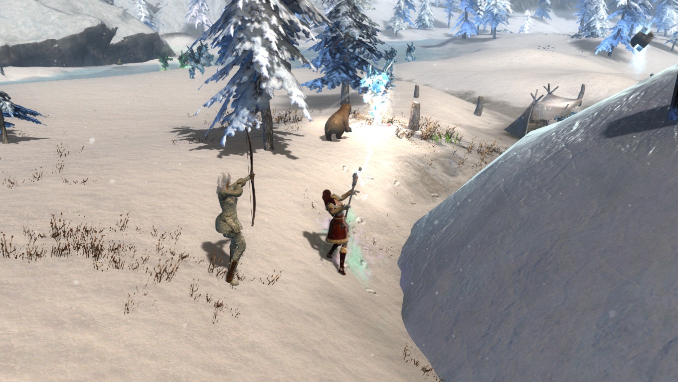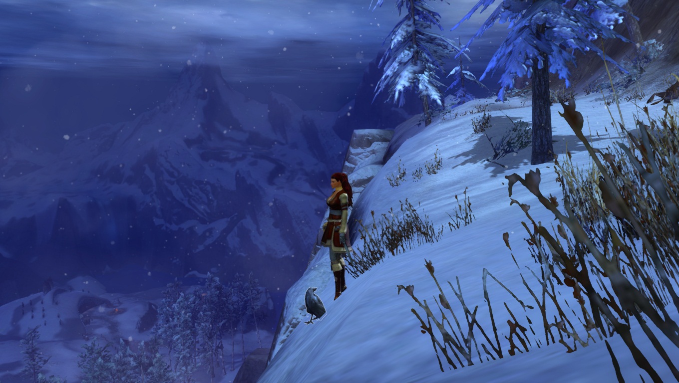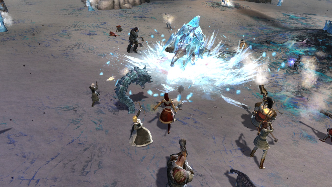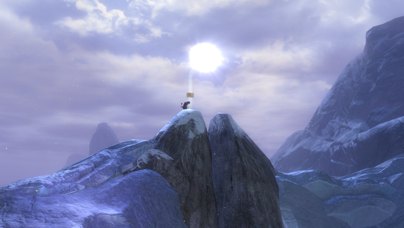 Lorsqu'on parcourt nos territoires sauvages enneigés, il faut toujours s'attendre à croiser de redoutables dangers. Ici, un Chaman des Fils de Svanir pas très content, qui s'est métamorphosé en une immonde créature de glace, et pouvant provoquer de gigantesques cyclones dans la région.