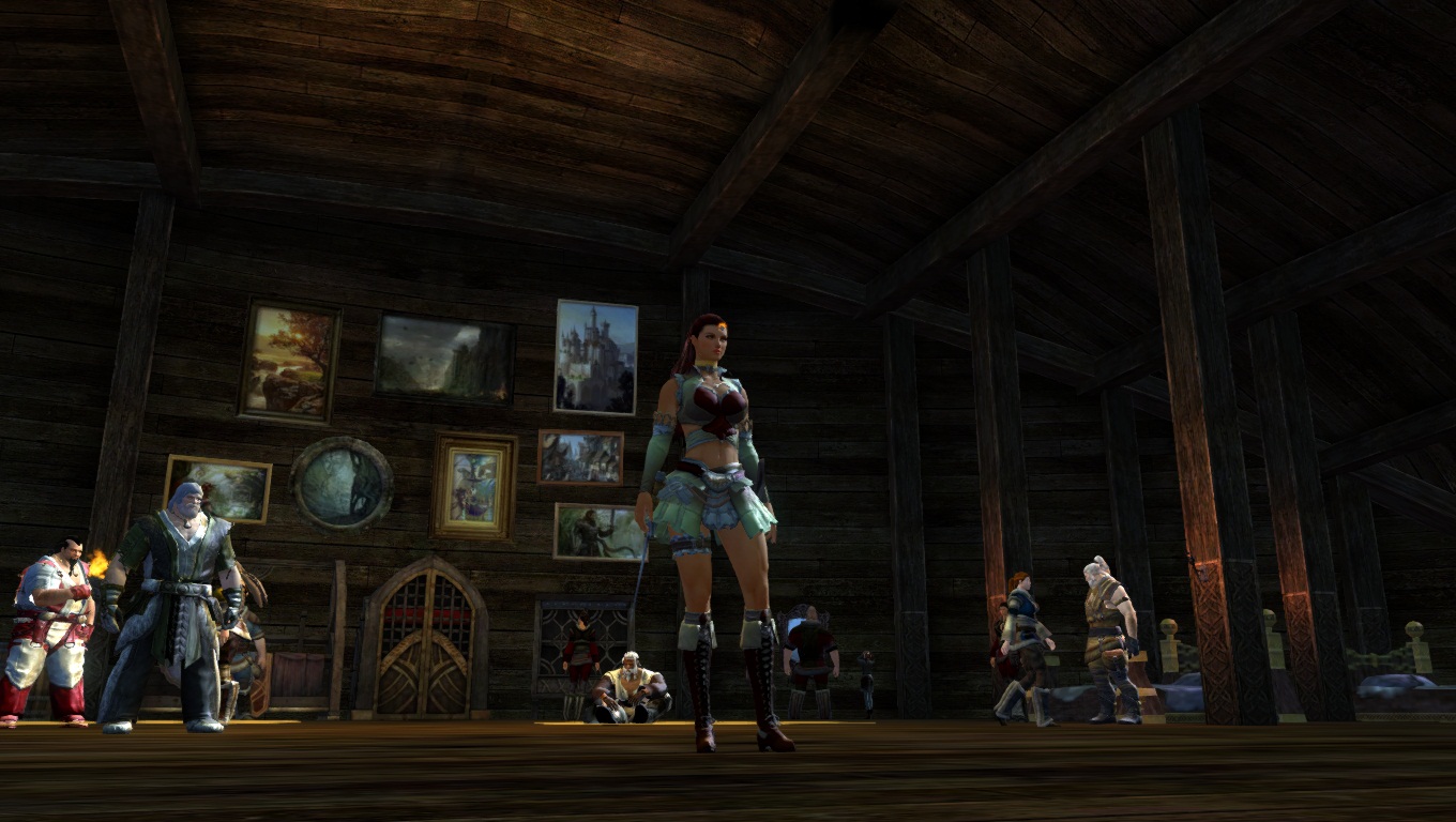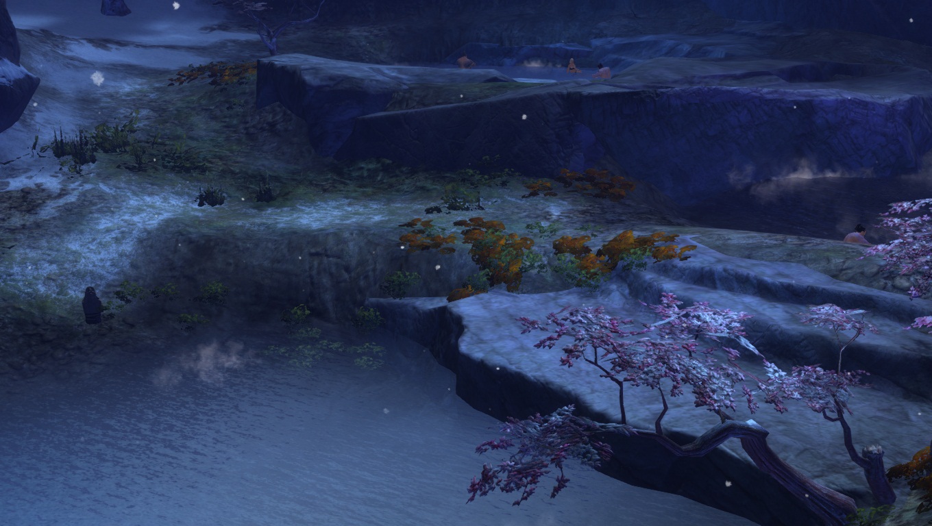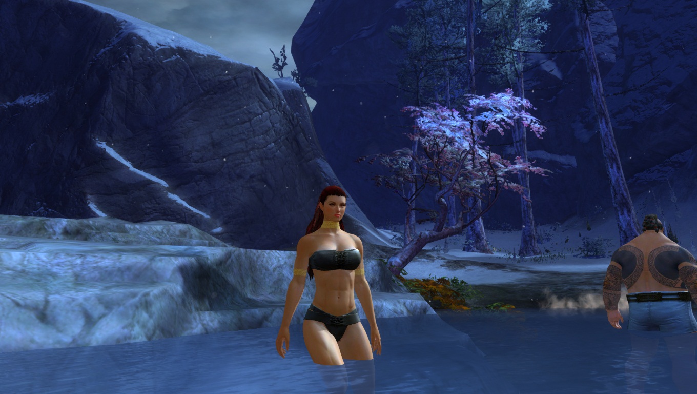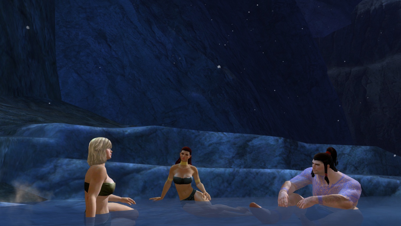 En soirée, une petite excursion aux sources chaudes en plein air près des montagnes. Comme vous pouvez le voir les femmes Norns sont très grandes (facilement 2m50, oui, les humains sont vraiment petits à côté). De plus, on appréciera la cohérence du fait, qu'elles ont naturellement une carrure imposante et une belle musculature, les Norns étant une race de Chasseur.