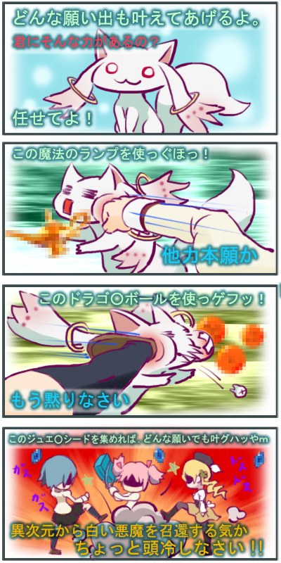 Un familier qui peut exaucer n'importe quel voeu de certaines filles, à la condition qu'elles deviennent par la suite des puellae magae et mènent une vie de combat.
