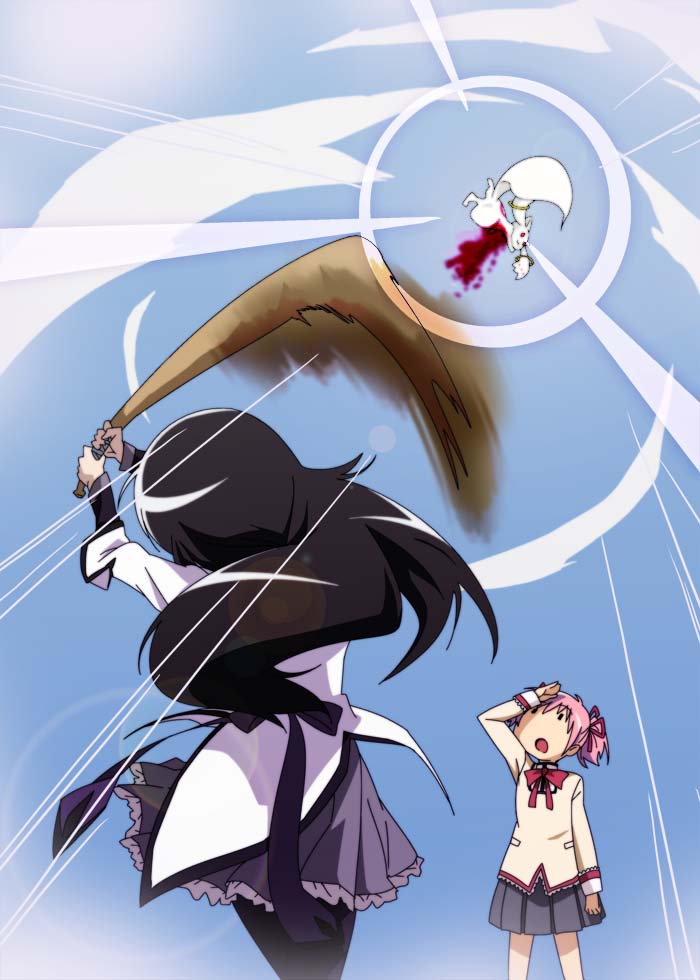 Citation :Il existe des familiers qui ont le pouvoir d'exaucer le vœu d'une fille choisie par leurs soins. Toutefois en compensation, cette fille doit alors devenir une puella magi (magical girl) et lutter contre des sorcières, créatures maléfiques nées de malédictions qui sont responsables de meurtres et de suicides.