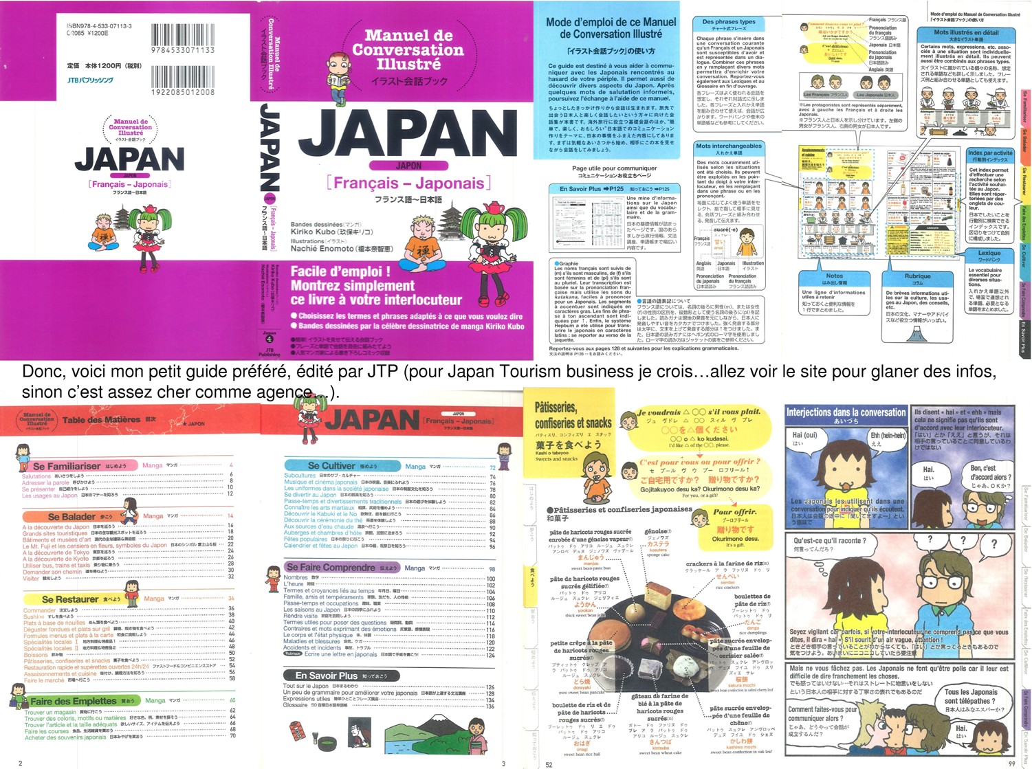 Il est édité par JTB publishing sur un mode ludique (petite bande dessinée et aspect visuel très sympa, voyez plutôt les scans), très clair et très complet. Il s’agit du Manuel de Conversation Illustré - JAPAN.