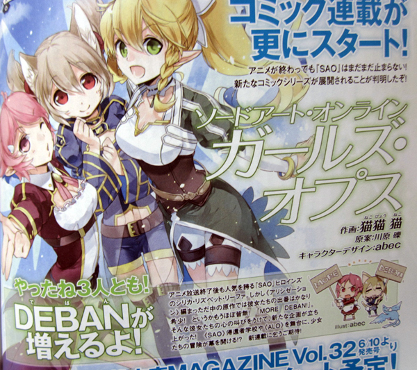 Une histoire basée sur les querelles entre les différentes puissances dans ce monde virtuel ? Ou bien Kirito va à la plage ? :|Et bien la réponse n'était pas dans la question ! Il y a u un sondage sur les personnages que les gens souhaitaient voir être plus développé et je sais pas mais je sens que le public masculin a envie de voir un spin off "harem".... Il s'agira de suivre le quotidien de Lisbeth, Silica, et Leafa. Le manga se nommera "Sword Art Online Girls Ops" et il débutera le 10 jiun 2013 au japon. Vous voilà prévenu. Source : http://www.animenewsnetwork.com/news/201...-ops-manga ****************************************************************