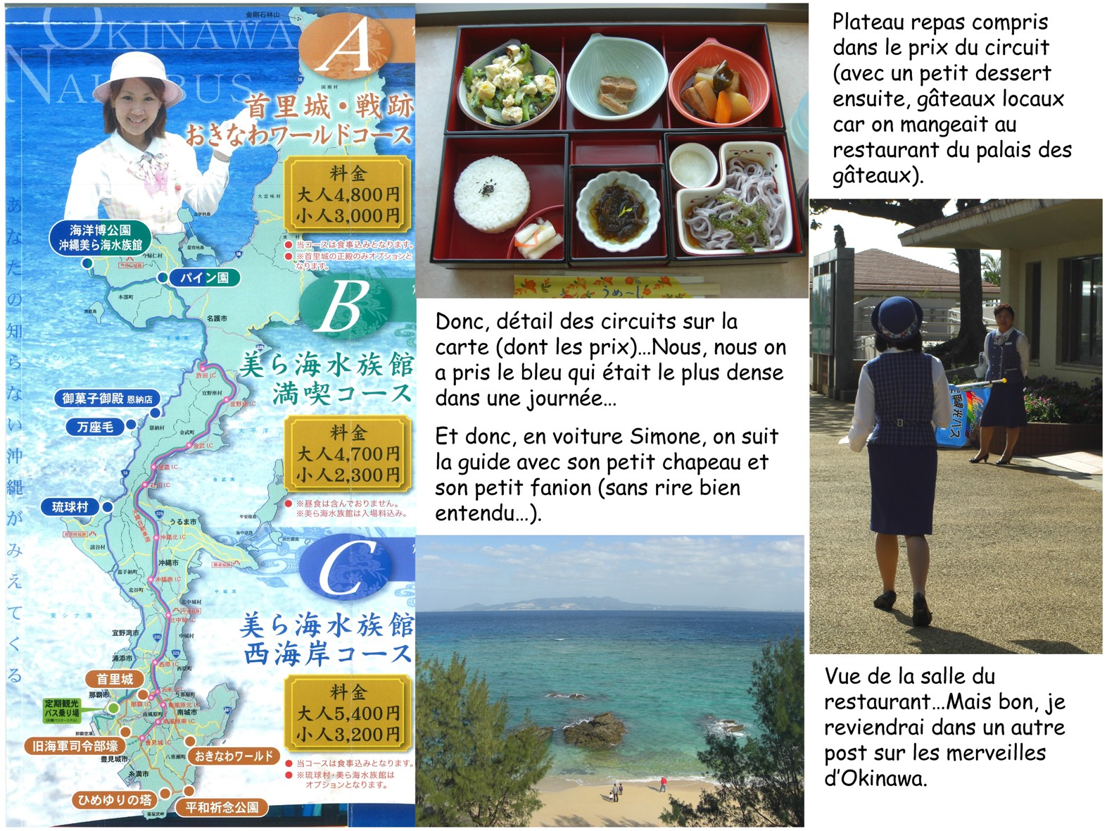 - la visite du village Okinawa et du complexe nautique sont en options ; en fait nous les avons prises et avons eu la surprise de se voir offerte la première visite (les Japonais sont très commerçants surtout en période creuse), soit un cadeau de 750¥ (toutefois celle du complexe nautique coûte 1620¥, mais cela vaut vraiment le coup) ;