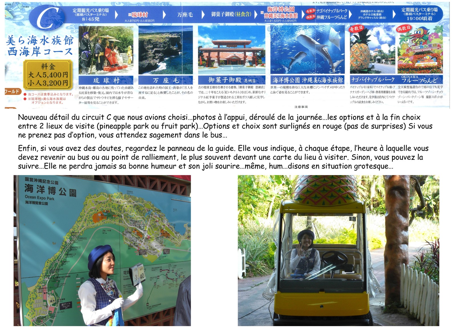 - les différents sites visités (village traditionnel Okinawa, le site naturel de la falaise de manza-mô, le palais des gâteaux où nous prendrons le repas, le complexe aquatique de Ocean Expo avec le plus grand aquarium au monde, le Okinawa Churaumi Aquarium, et enfin pineapple park et sa culture d’ananas à partir duquel on fait même du vin blanc !) ;