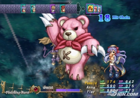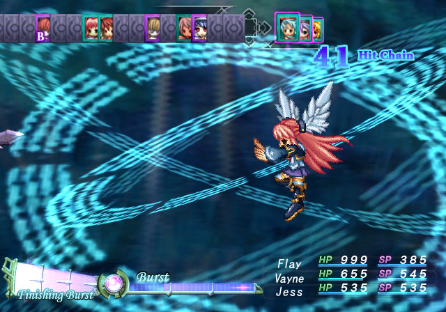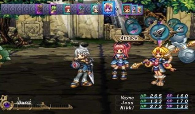 Les combats sont en tour par tour avec 3 personnages actifs et 3 personnages en soutiens interchangeable en combat et qui permettent des actions spéciales. Une barre de Burst se remplit pendant le combat et qui permet d'augmenter les dégâts lorsqu'elle est pleine et permet aussi de déclencher des attaques ultimes.
