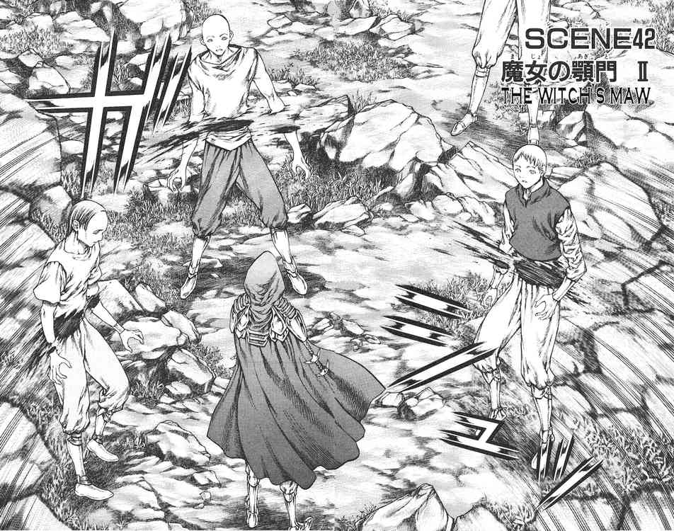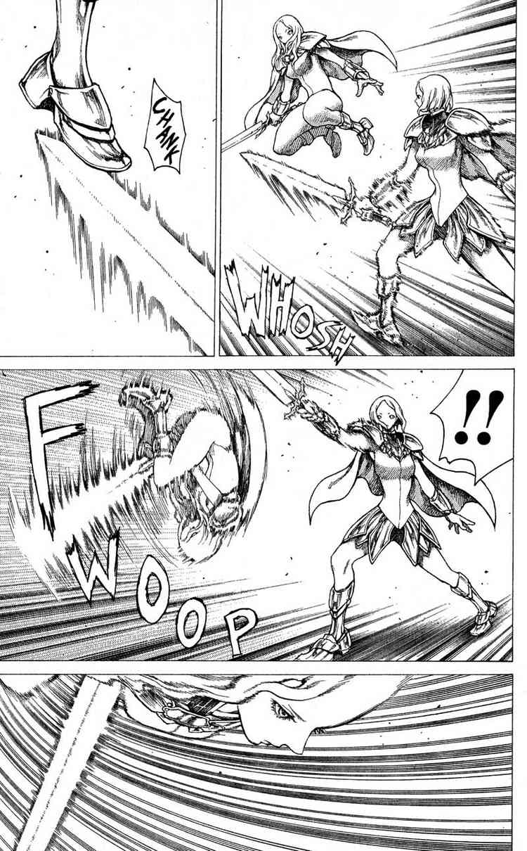 Claymore, c'est tout d'abord l'histoire d'une chasse aux démons, tout ce qu'il y a de plus classique me direz-vous. Avec les premiers tomes qui nous présentent cet univers médiéval à l'ambiance sombre et morose, où on ne vit pas vraiment en sécurité. Mais rapidement les choses changent, avec l'apparition du personnage charismatique qu'est Teresa la Souriante. C'est alors à ce point précis que le scénario de Claymore va faire un bond incroyable en prenant une forme exponentielle. Passionnant et dynamique, ponctué par de nombreuses révélations au fil de l'aventure, il ne cessera de croître comme une flèche qui monte vers les cieux du premier au dernier tome. Jusqu'à même devenir gênant pour certains lecteurs car cela donne l'impression que ça ne finira jamais. Mais personnellement cela ne m'a point gêné pour le moment, j'ai vraiment envie de voir jusqu'à quel sommet, le scénario de Claymore nous emmènera. En parallèle et parfaite complémentarité avec le scénario, la narration est dotée d'un atout de taille, un rythme effréné, d'une vélocité surprenante que j'ai rarement vu dans un manga, on a à peine le temps de reprendre son souffle que quelque chose de plus grand et fort arrive. Les combats sont excellents et se jouent toujours à un cheveu, à l'extrême limite de l'impossible et du désespoir total. Toutefois, tous les personnages peuvent mourir ! Même les plus puissants !! Ils sont tous utilisés comme de vulgaires outils qu'on peut jeter à tout moment, et cela donne une certaine anxiété au lecteur qui a le malheur de s'y attacher, bien que l'auteur donne justement souvent le parfait petit détail pour qu'on s'y attache rien qu'un peu (passé tragique, personnalité inhabituelle, humanité, etc...). En même temps, cela permet de ne pas avoir de longueurs durant la narration, ce qui est une bonne chose, bien qu'assez cruel car certains personnages vous marqueront à coup sûr. En gros, la narration est excellente à chaque tome, on en a clairement pour notre argent, notre pesant de cacahouète. Un gros plus !